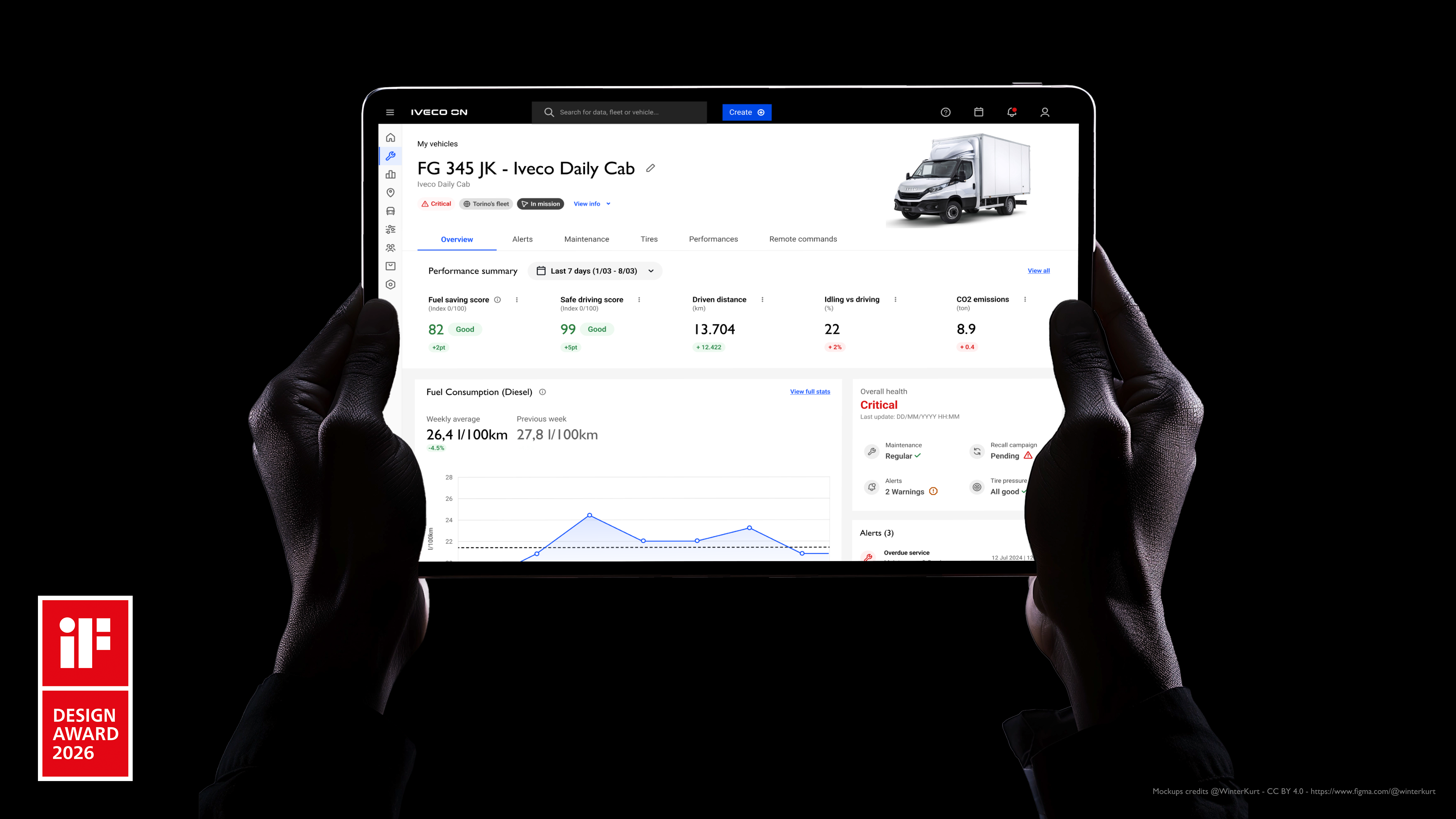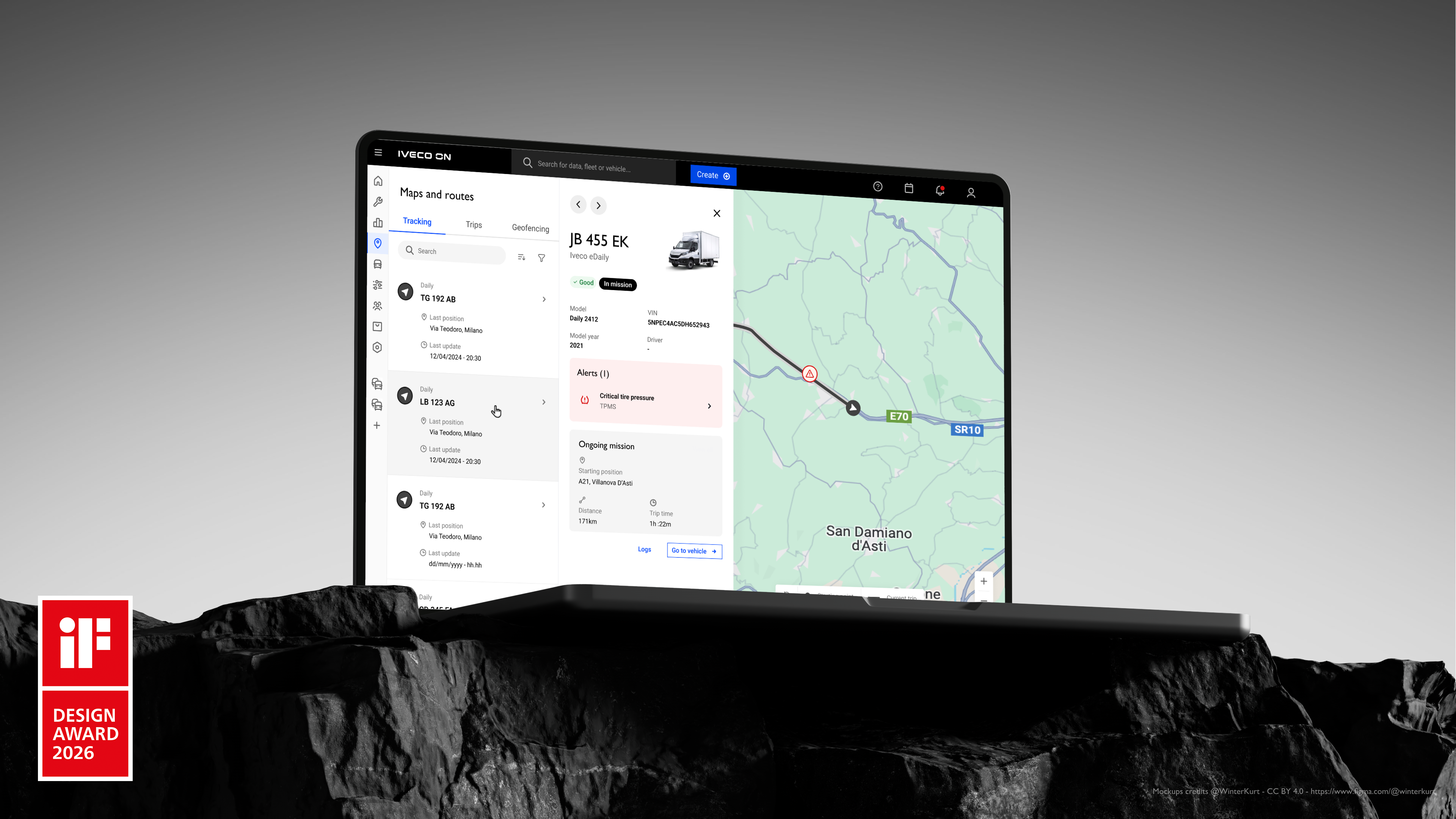 Letošní ročník iF DESIGN AWARD zaznamenal více než 10 000 přihlášek z 68 zemí světa. Tímto oceněním porota iF DESIGN AWARD potvrzuje vedoucí postavení společnosti IVECO v oblasti vývoje pokročilých digitálních řešení zaměřených na uživatele pro dopravní průmysl. Platforma IVECO ON nastavuje nový standard v oblasti správy vozových parků – zaměřuje se nejen na sběr dat, ale především na jejich interpretaci, flexibilitu a špičkový design.
